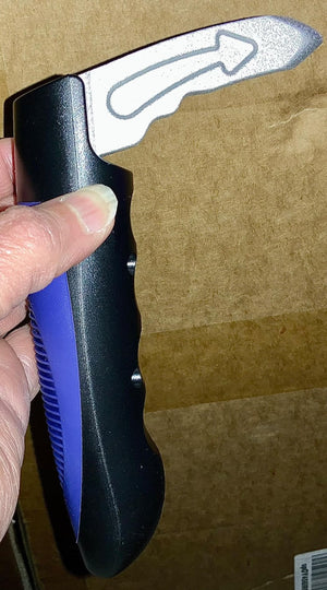 La cuchilla de acero inoxidable corta cinturones atascados rápidamente, con un protector que evita cortes accidentales.